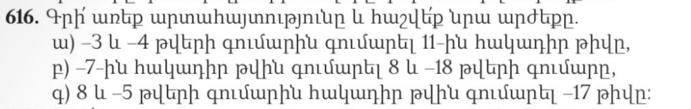 ա) –3 և –4 թվերի գումարին գումարել 11-ին հակադիր թիվը, -3+-4+-11=-18
