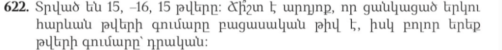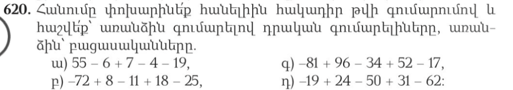 բ) –7-ին հակադիր թվին գումարել 8 և –18 թվերի գումարը 7+8+-18=-3