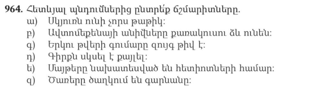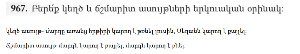 Մարդկային — անմարդկային, ծայրահեղ-ծայրահեղություն, գիտակցություն-անգիտակցություն, ակնաբույժ-ակնաբուժարան, մթնոլորտ-մթնոլորտային, որոշում-որոշակիություն, ընդհատ-ընդհատել, օրինաչափ-օրինաչափություն, ձեռնարկ-ձեռնարկություն, մանրէ-մանրէաբան, փոխանակություն-անփոխանակություն: