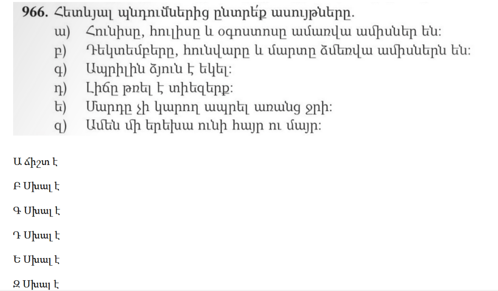 Հողն ինքնամաքրելու (ինքն, մաքուր, ել) հատկություն (հատուկ, ություն) ունի: Դա չի նշանակում, թե կարելի է նրան չափազանց (չափ, անց) շատ ծանրաբեռնել օրգանական (ծանր, բեռն, ել) (օրգան, ական) և անօրագական (ան, օրգան, ական) թափոններով(թափ, ոն), բնակավայրում(բնակ, վայր) հավաքված կենցաղային (կենցաղ, ային) աղբով, որովհետև հոդի հնարավորությունները (հնար, ավոր, ություն)նույնպես (նույն, պես)անսահման (ան, սահման) չեն: Իսկ թափոններով (թափ, ոն)աղտոտված (աղտ, ոտ, (վ)ած) հողը սպառնում է հիվանդությունների (հիվանդ, ություն) առաջացման պատճառ դառնալ: