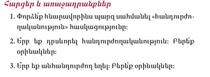 1. Հանդուրժողականություն նշանակում է ինչ-որ մի բանի կողմ լինել, կամ դրա դեմ չհակաճառել: