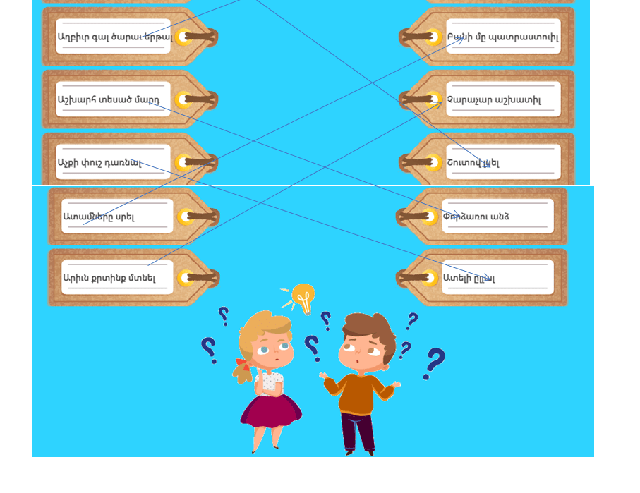 Ես աշխատում եմ գործարանում: – Ես կաշխատիմ գործարանին մը մեջ: