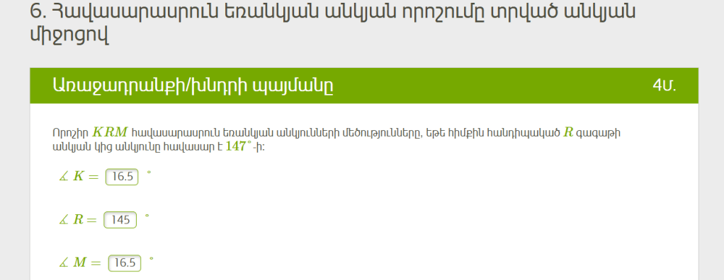 Գտնել երրորդ անկյունը։ Պատ.՝75° - Եռանկյան երկու կողմերը 5 սմ և 7 սմ են, նրանց միջև ընկած անկյունը՝ 60°։