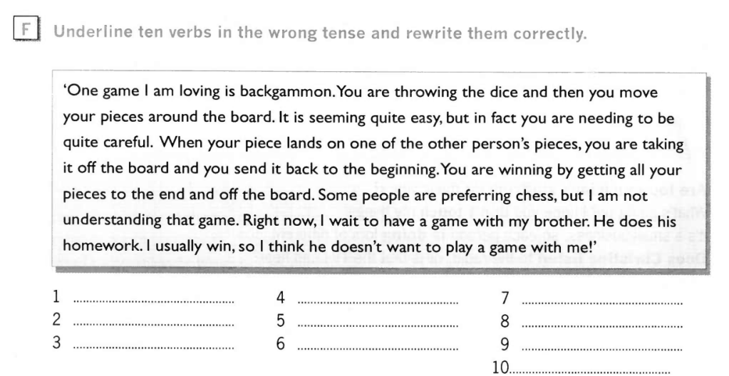 One game that I love is backgammon. You throw the dice and then you move your pieces around the board. It seems quite easy, but in fact you need to be quite careful. When your piece lands on one of the other person’s pieces, you take it from it off the board and you send it back to the beginning. You win by getting all your pieces to the end and off the board. Some people prefer chess, but I don’t understand that game. Right now, I am waiting to have a game with my brother. He is doing his homework. I usually win, so I think he doesn’t want to play a game with me!