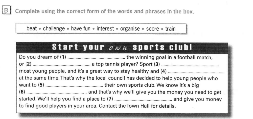 Do you dream scoring the winning goal in a football match, or beating a top tennis player? Sport interests most young people, and it is a great way to stay healthy and have fun at the same time. That is why the local council has decided to help young people who want to organise their own sports club. We know it is a big challenge, and that is why we will give you the money you need to get started. We will help you find a place to train and give you money to find good players in your are. Contact the Town Hall for details.