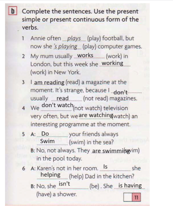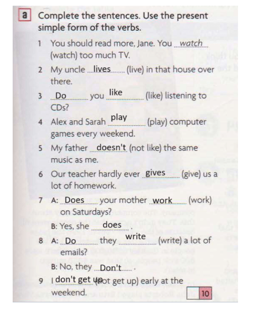 1- My family often goes (go) out for dinner. 2- Jason and Lisa always like (like) to talk in class. 3- She drinks (drink) coffee all the time .4 – They never listen (listen) to the teacher. 5 – A good student always performs (perform) well in class. 6 – Our friends sometimes meet (meet) up in the shopping mall. 7 – Her aunty likes (like) to cook dinner for people. 8 – John’s dog usually obeys (obey) him. 9 – Lisa never does(do) her homework. 10. Every morning I get up(get up) at seven o’clock and have (have) a shower.